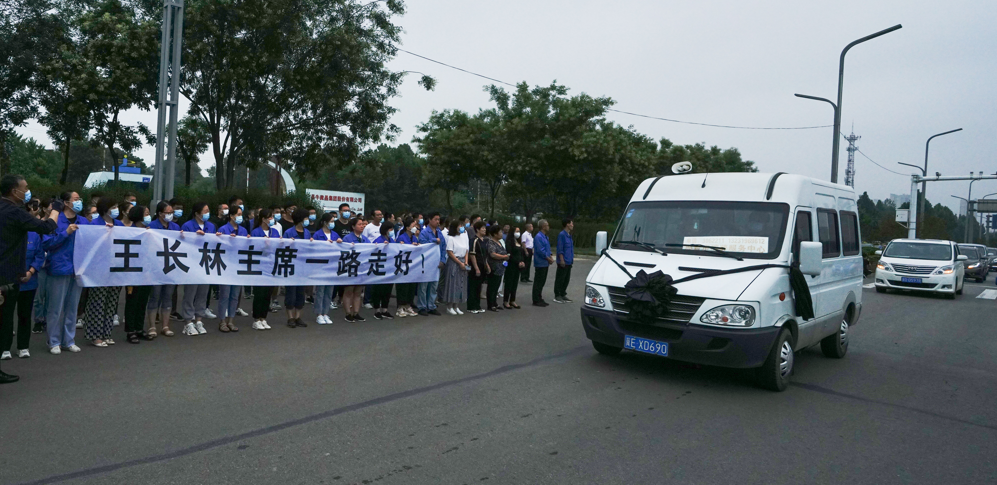 7月5日上午,晶牛集團干部員工打出“王長林主席一路走好!”的挽幛,身著工裝站立在邢州大道晶牛集團總部門口,用音箱反復播放著企業之歌《晶牛頌》,灑淚送別敬愛的董事長。9時正,王長林同志的追悼會在河北省邢臺殯儀館馬鞍山公園1號大廳舉行,大廳循環播放著王長林同志的生前影像,省市各級領導,王長林同志的家人、親友、晶牛的干部員工代表等500多人胸前佩戴白花,為王長林的忠魂默哀,抑制不住悲傷情緒失聲痛哭向他作最后告別。王長林同志的遺體上覆蓋著鮮紅的黨旗,躺在鮮花和蒼松翠柏之中,“你終于可以好好歇歇了”人們都在心中默默為他祈禱!